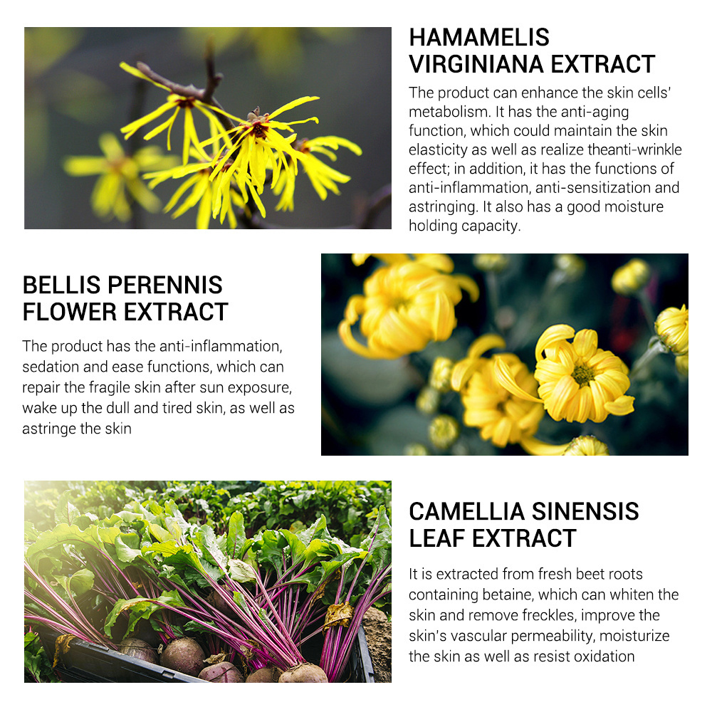 • --HAMAMELIS VIRGINIANA EXTRACT The product can enhance the skin cells' metabolism. It has the anti-aging function, which could maintain the skin elasticity as well as realize the anti-wrinkle effect; in addition, it has the functions of anti-inflammation, anti-sensitization and astringing. It also has a good moisture holding capacity.